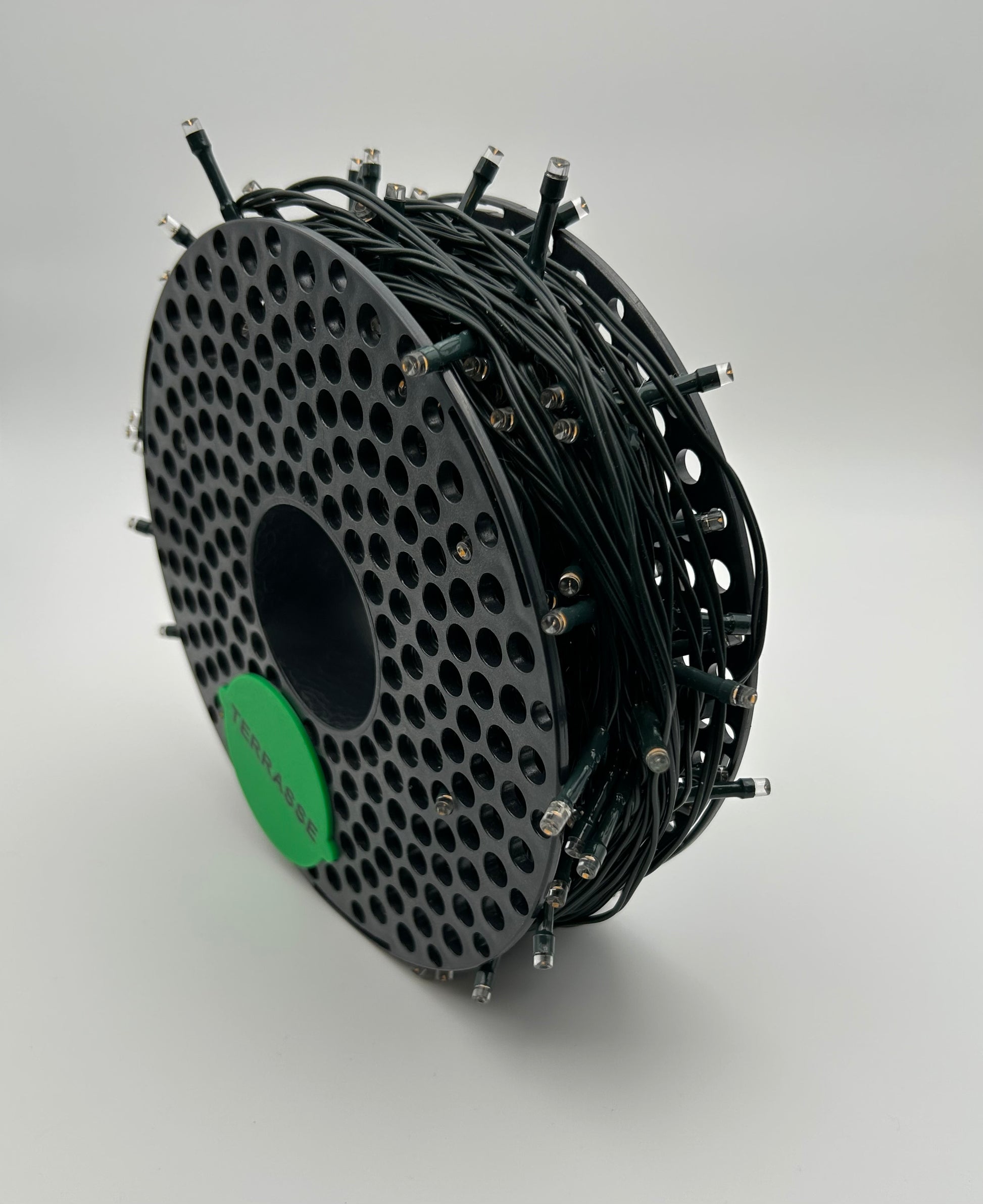 Denne ledningstrommelen er laget av kraftige industrispoler som ellers ville blitt kastet. Vi har gitt dem nytt liv som en solid og praktisk løsning for lagring av lyslenker, med miljø og bærekraft i fokus.
